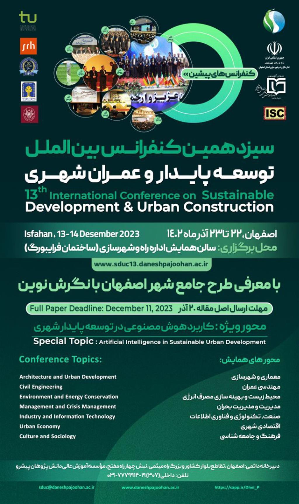 Sustainable development as an effective movement against the adversities of the modern world, attempts to organize and secure our future. As it is defined by the World Commission on Environment and Development (WCED), sustainable development considers the needs of both present and future generations. Altogether, its main objective is to improve human life on earth, which requires the coordination and cooperation among economic, social, and environmental aspects. By the economic advances and the eradication of poverty, mankind can reach peace, safety and social health, and a bright future is imaginable; however, economic growth spreads pollution and contaminations, endangering the environment. Sustainable development tries to subdue this chaos. Furthermore, by the acceleration in urbanization and reaching 70% total urban population in the near future, as well as the impacts of human manipulations on the surface of the earth, we are once again reminded of the essence of urban sustainable development. This great responsibility rests on the shoulders of universities and academic institutions to nurture proficient and thoughtful forces to scientifically compensate for the shortcomings of development in the future. That’s why Daneshpajoohan Pishro Higher Education Institute, having the experience of conducting twelve national and international conferences, has held ‘the 13th International Conference on Sustainable Development and Urban Construction’ with cooperation of country executive organizations and internal and foreign universities on 14th to 15th of December, 2023.